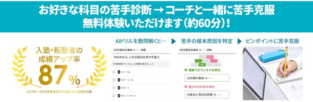 AIによる苦手の根本原因診断を含む無料体験実施中!