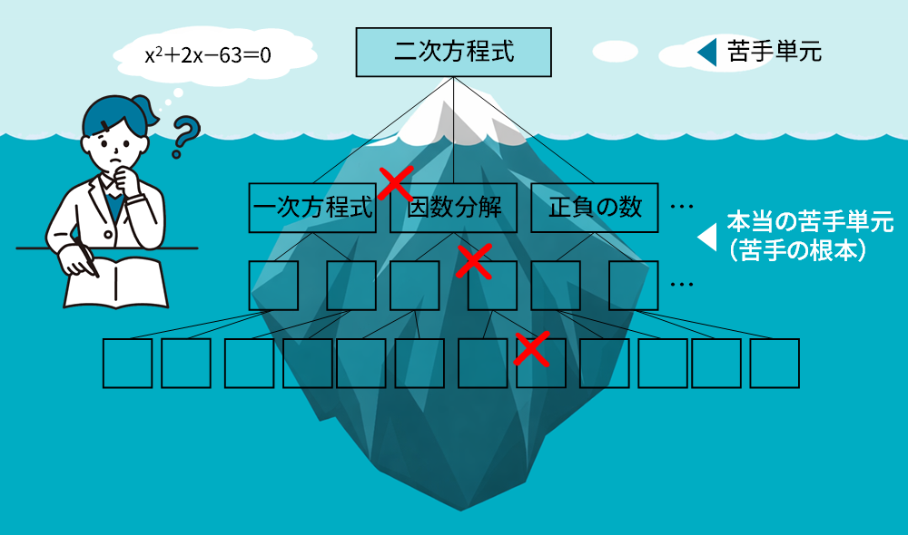 例えば中学数学のラスボス「二次方程式」が苦手な人は多いですが、実は過去に習ったはずの一次方程式の理解が誤っていたり、因数分解が不得意だったり、正負の数を勘違いしていたり、苦手の原因は人それぞれ。特に数学・英語のような積み上げ型科目は苦手が蓄積しどんどんついていけなくなるので、過去にさかのぼって苦手の根本をつぶしながら、前に進むことが有効です。